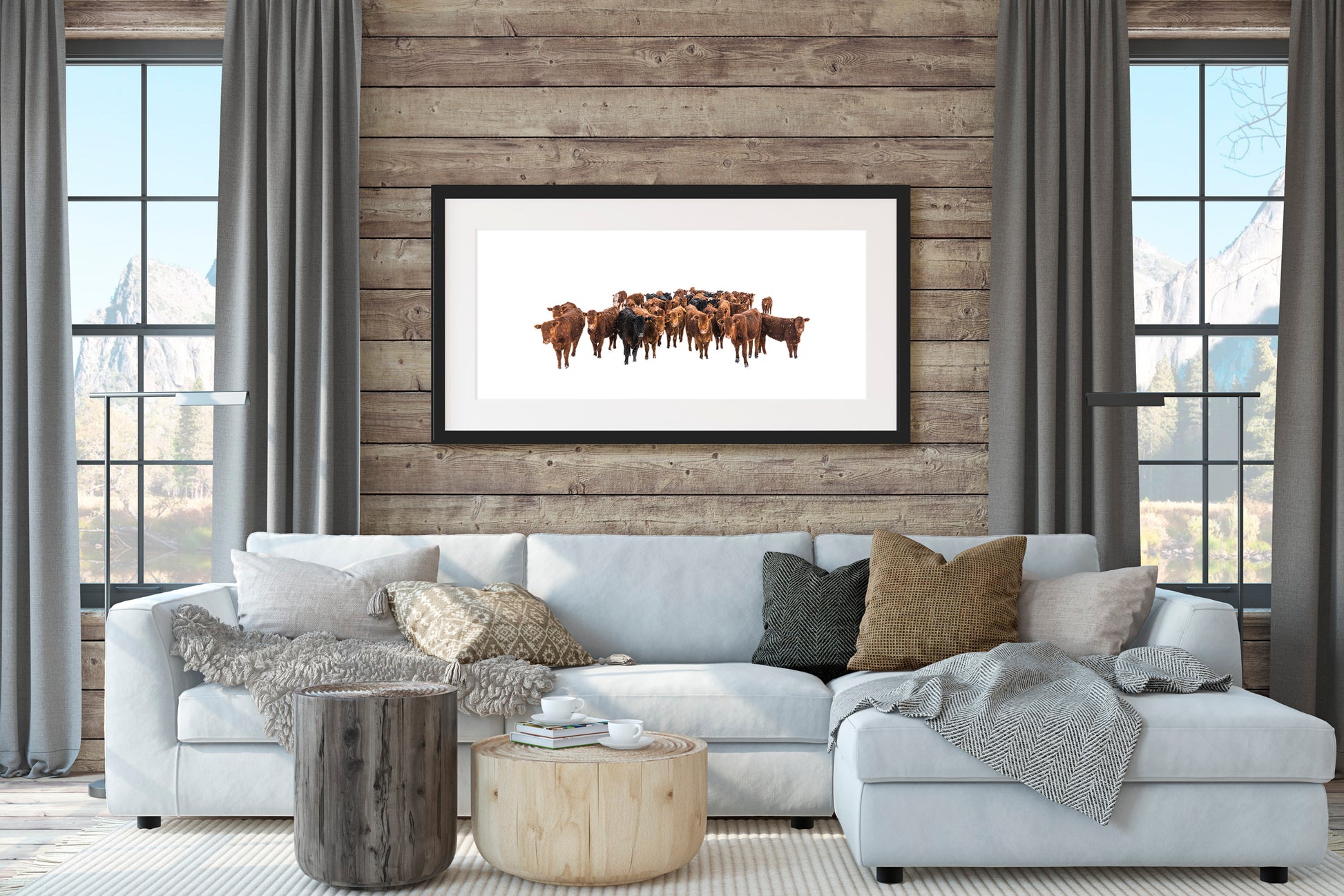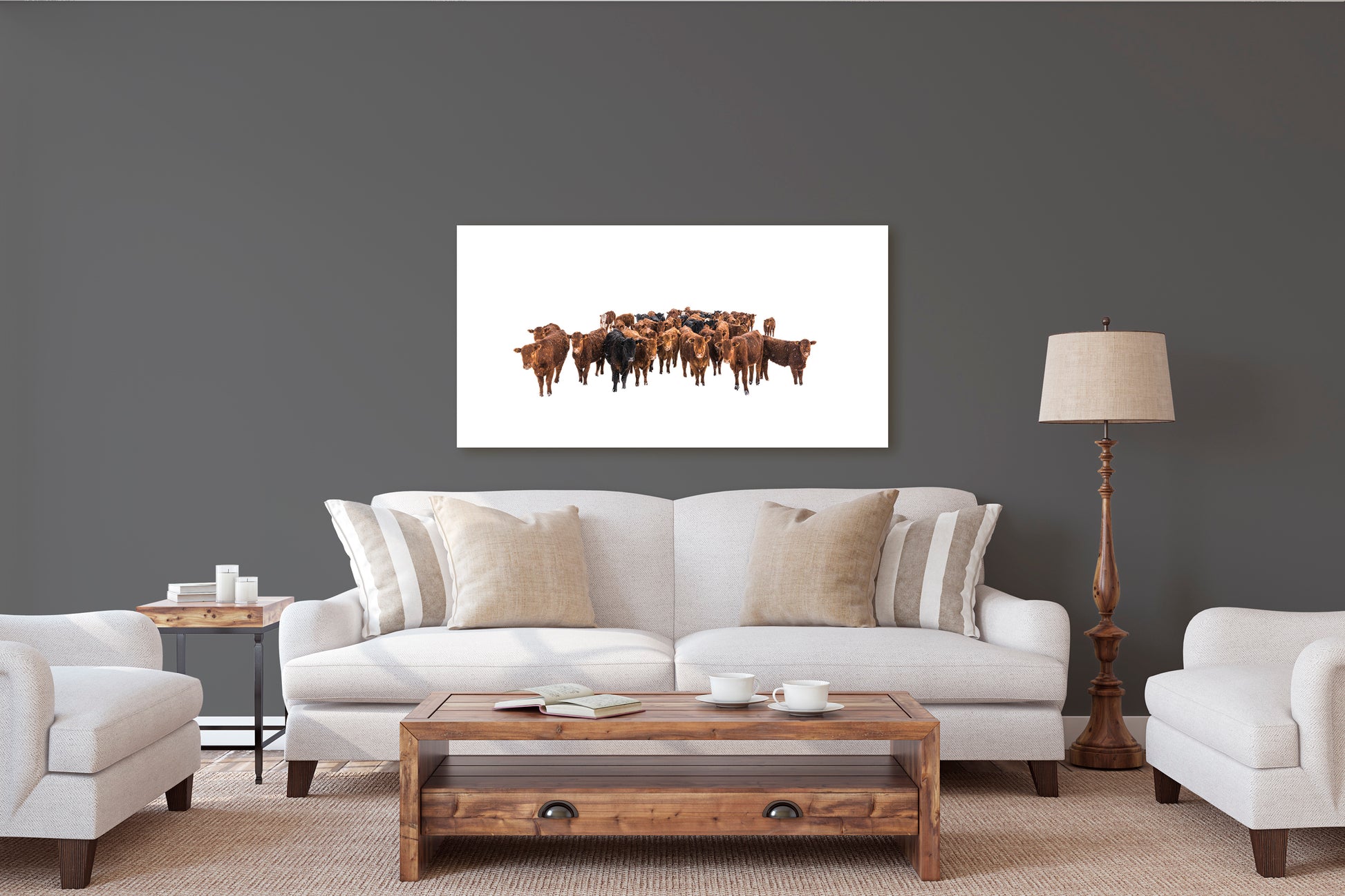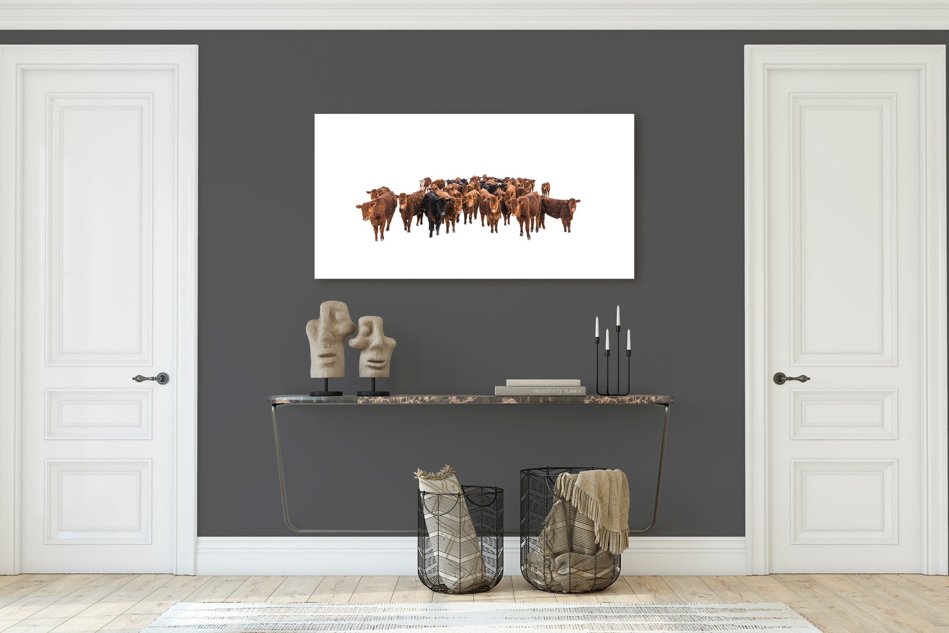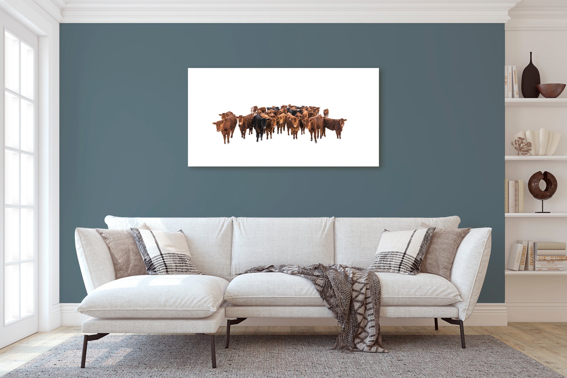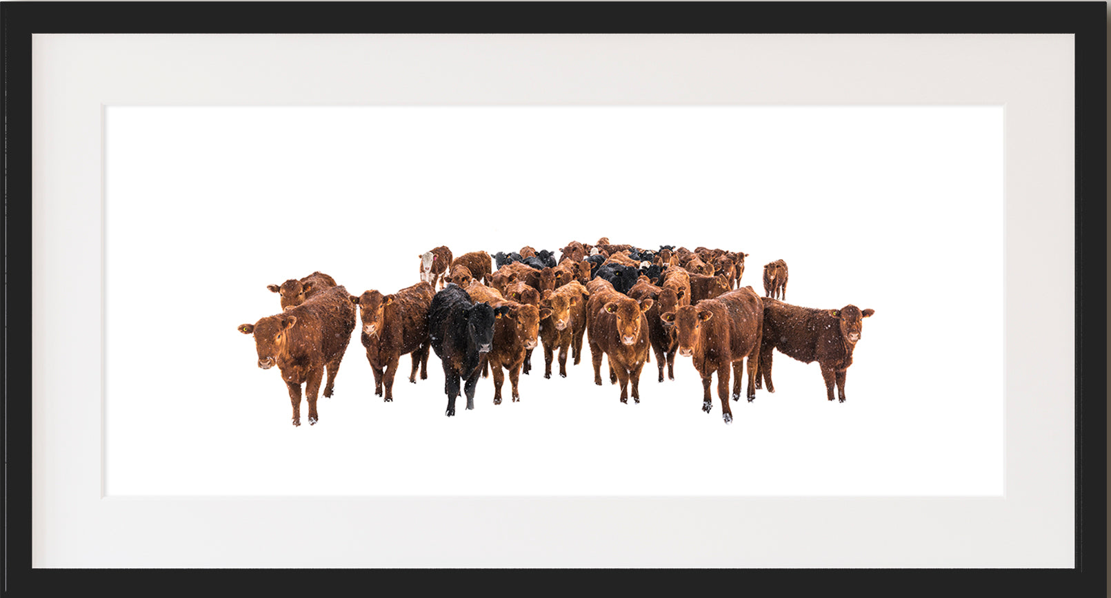 On the vast snow-covered prairies of Alberta, a herd of curious cattle gathers, their warm brown coats standing in bold contrast to the endless white. The falling snow dusts their backs as they lock eyes with the camera—steadfast, inquisitive, and unbothered by the cold.