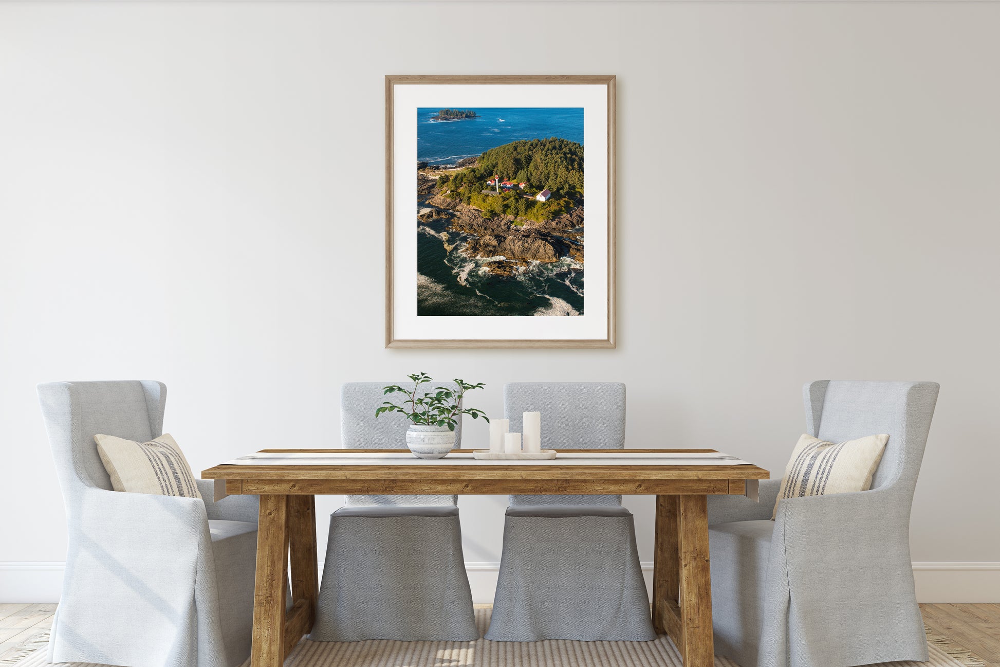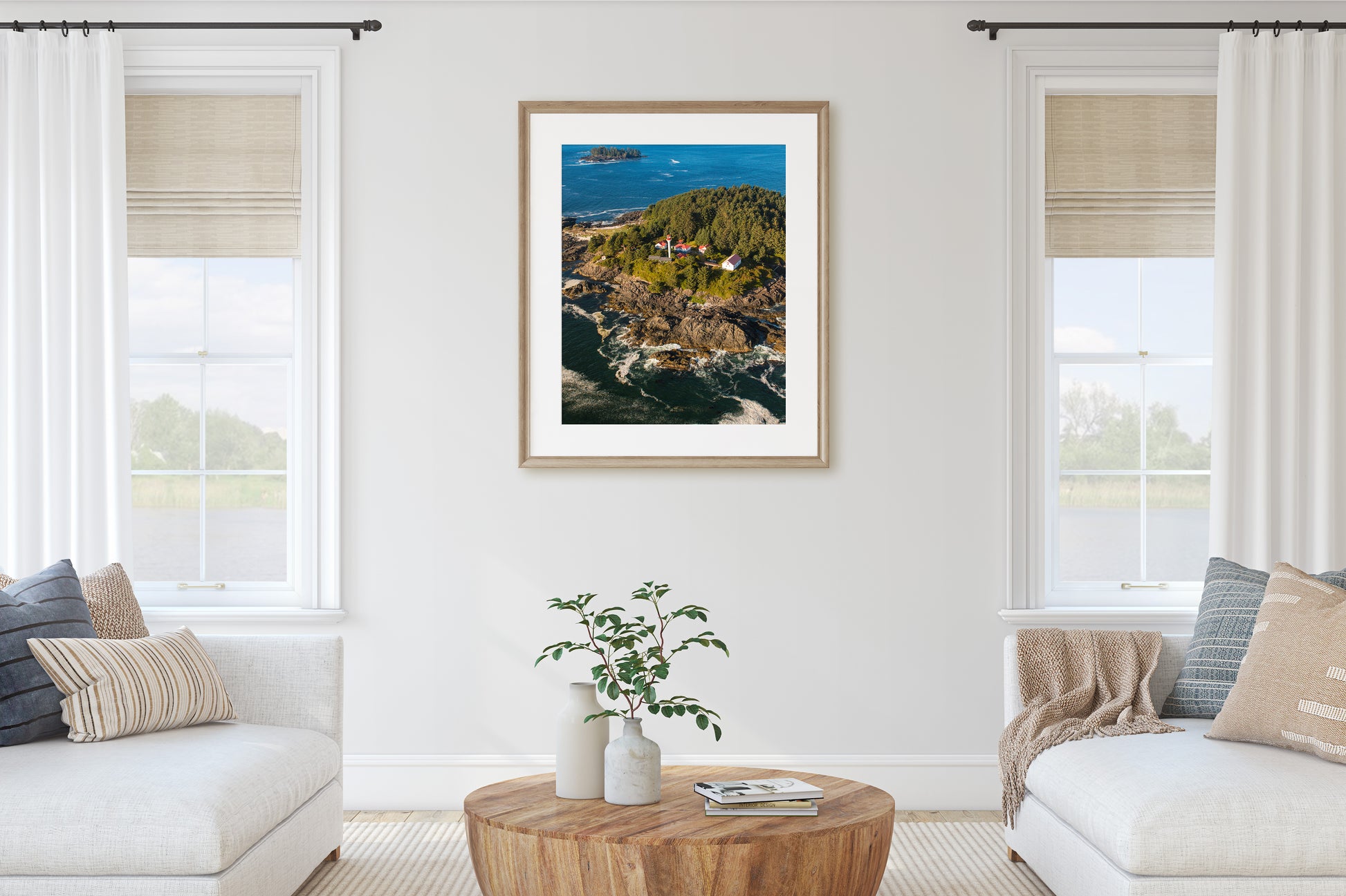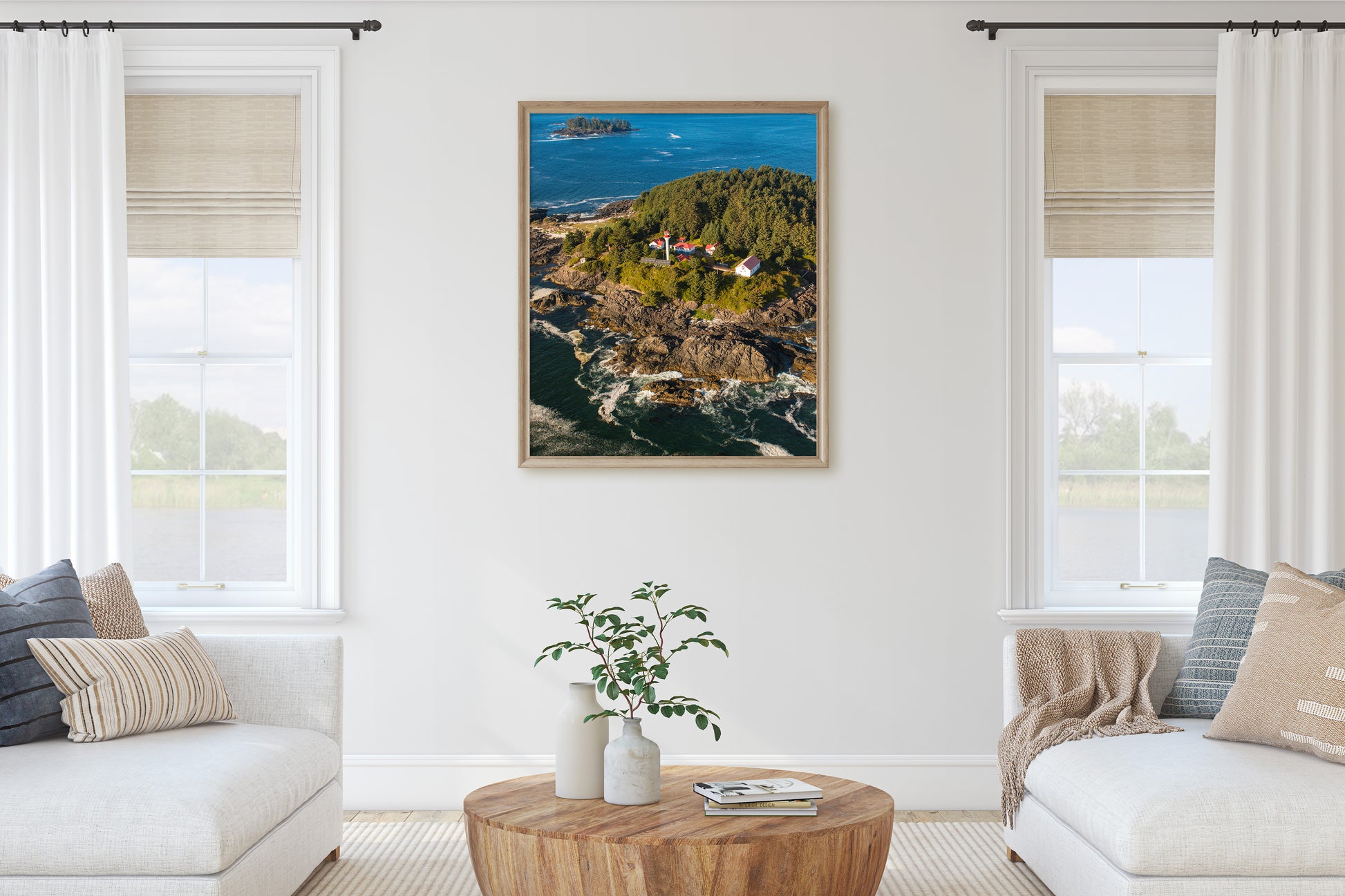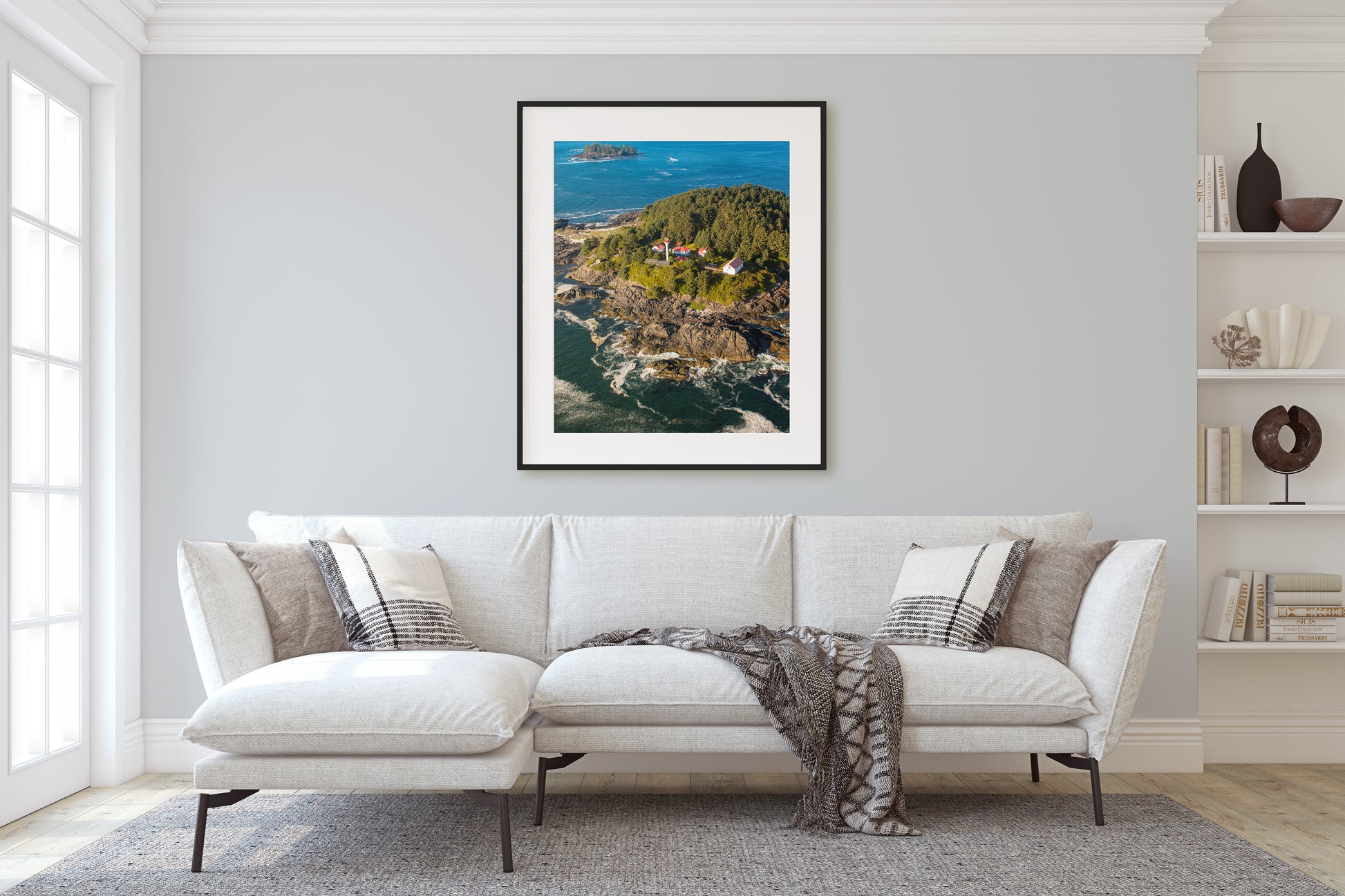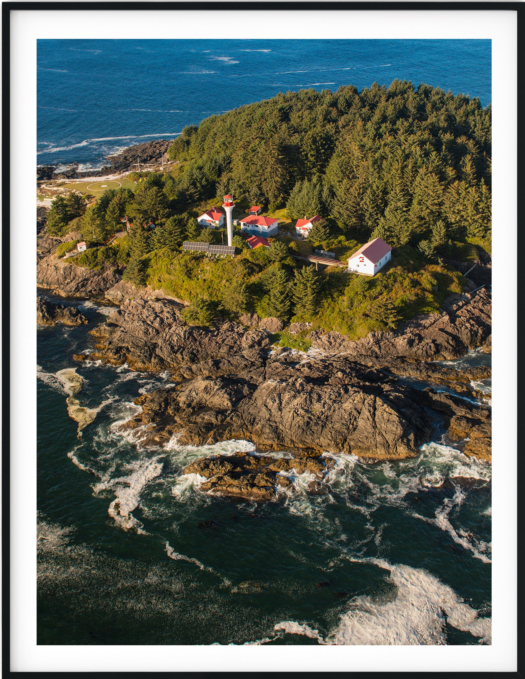The familiar sight of Lennard Island Lighthouse, usually spotted from Cox Bay or South Chesterman Beach, felt entirely new from this vantage point. Flying overhead, I saw the raw power of the Pacific meeting the rugged coastline, waves carving endlessly into rock. The red-roofed lighthouse station stood resilient against the blue expanse beyond—a quiet sentinel in the ever-moving sea.