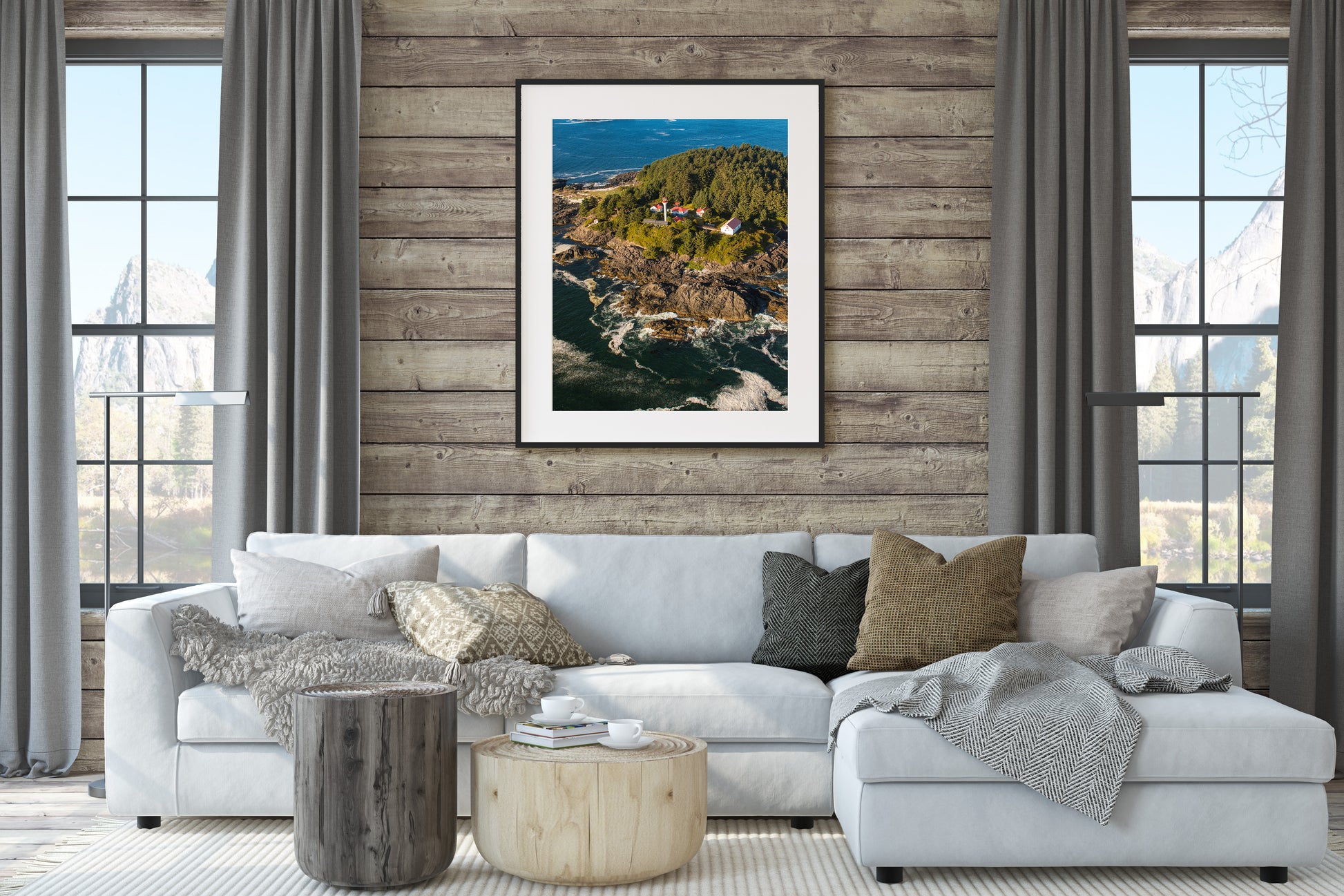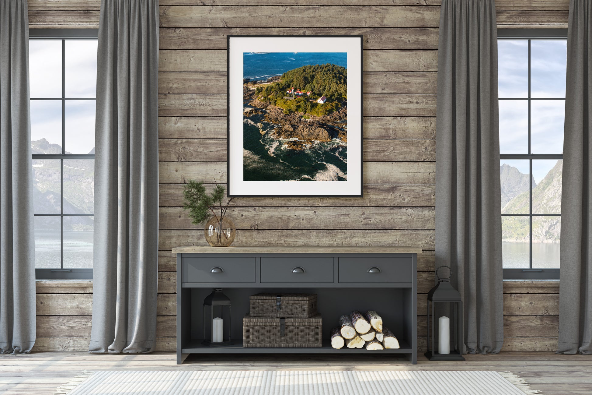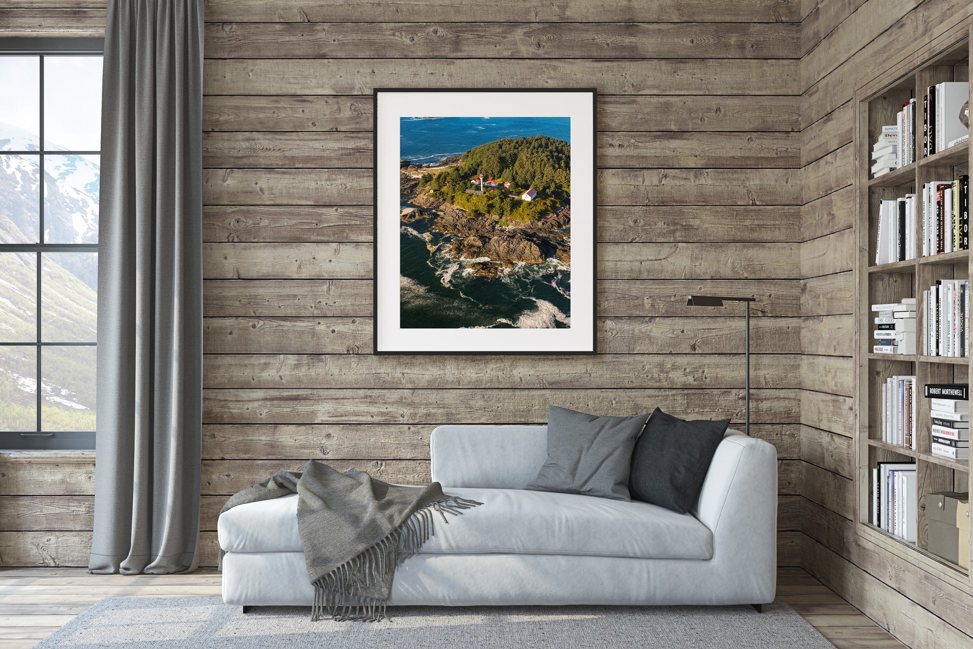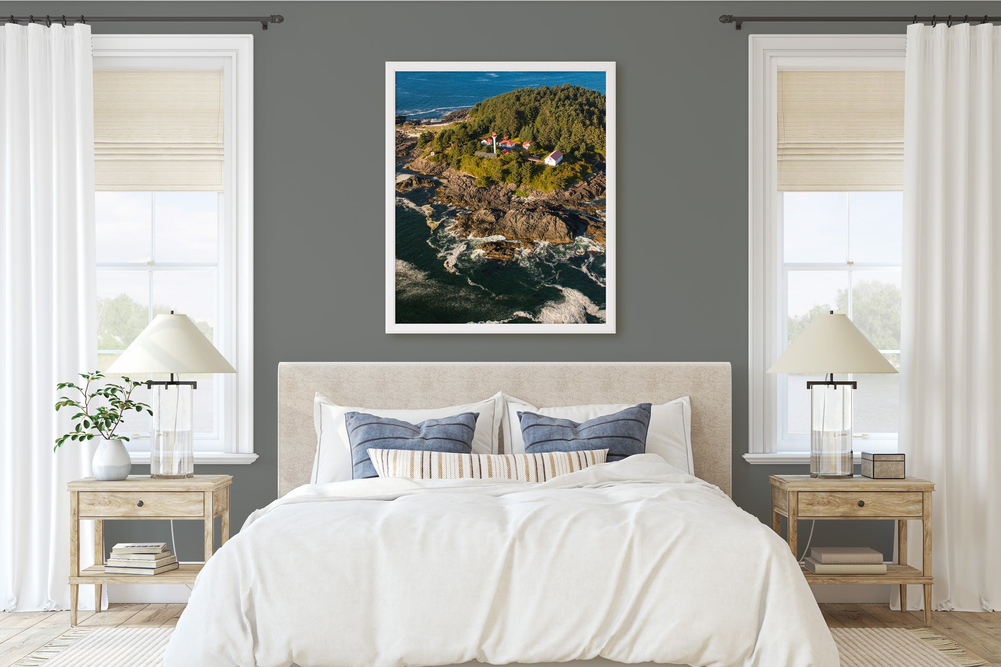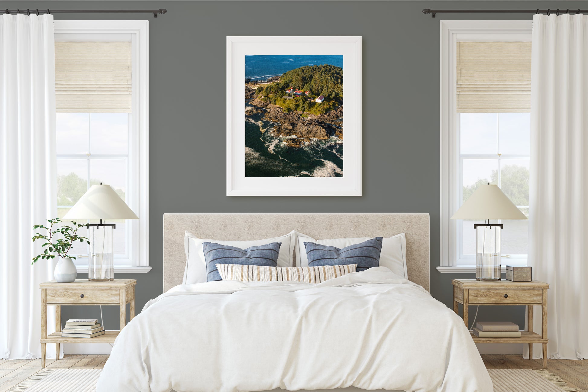 The familiar sight of Lennard Island Lighthouse, usually spotted from Cox Bay or South Chesterman Beach, felt entirely new from this vantage point. Flying overhead, I saw the raw power of the Pacific meeting the rugged coastline, waves carving endlessly into rock. The red-roofed lighthouse station stood resilient against the blue expanse beyond—a quiet sentinel in the ever-moving sea.