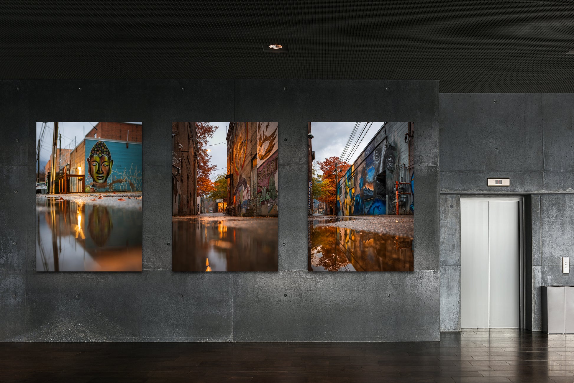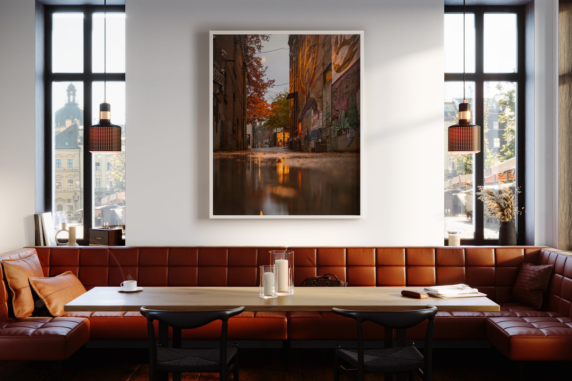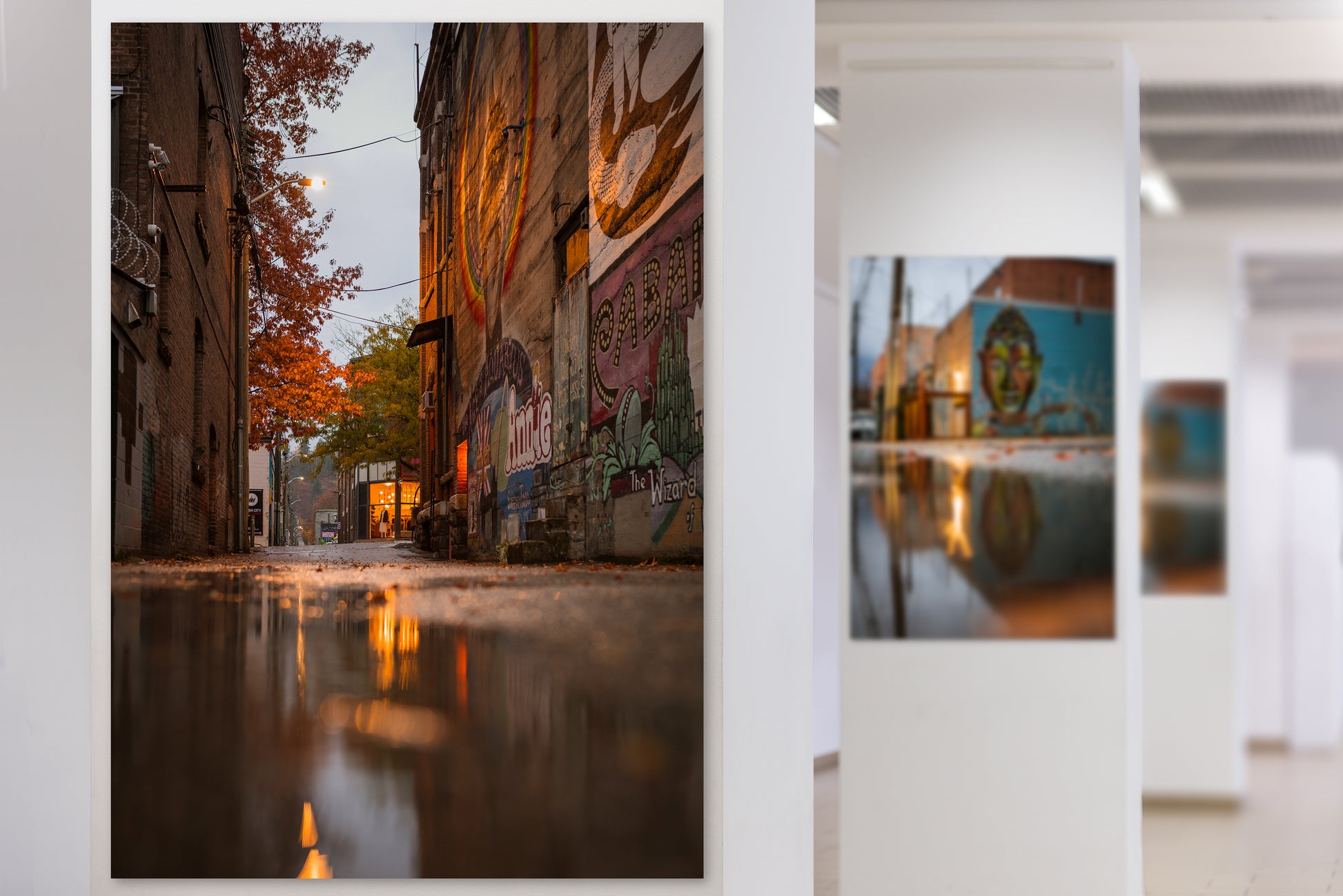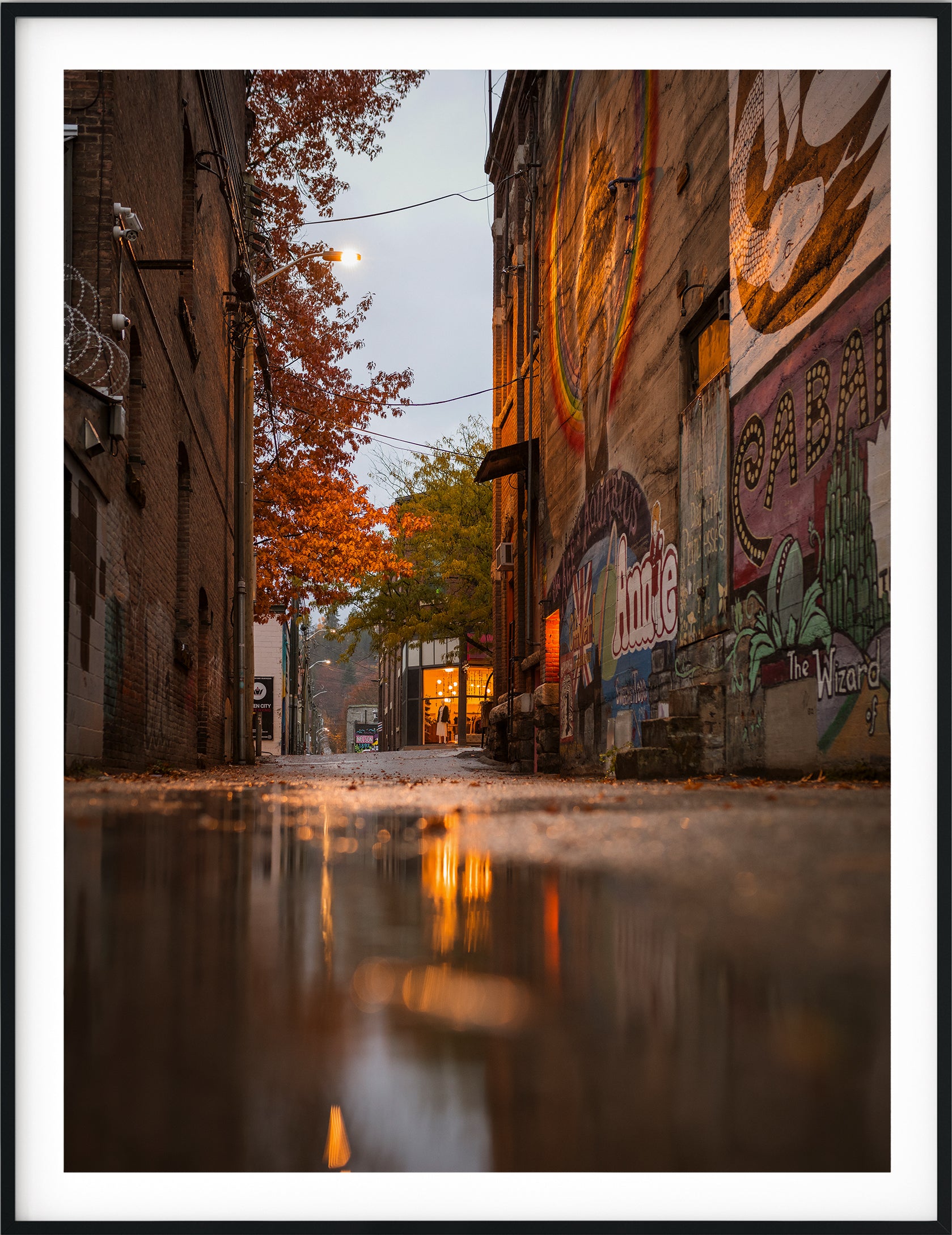 Rain gathers in a Nelson back alley, turning cracked pavement into a soft mirror of memory. Graffiti-covered walls hold the stories of years gone by, their colors blurred and gentled by the rain. Above it all, autumn glows—gold and rust leaves catching the last light, reminding me how quickly seasons pass here, and how beautiful that passing can be.