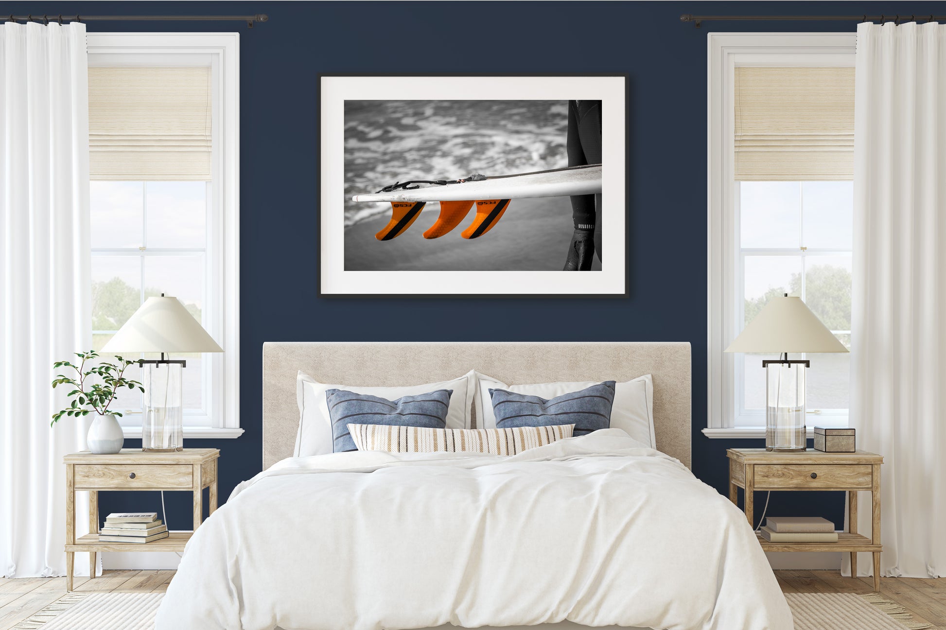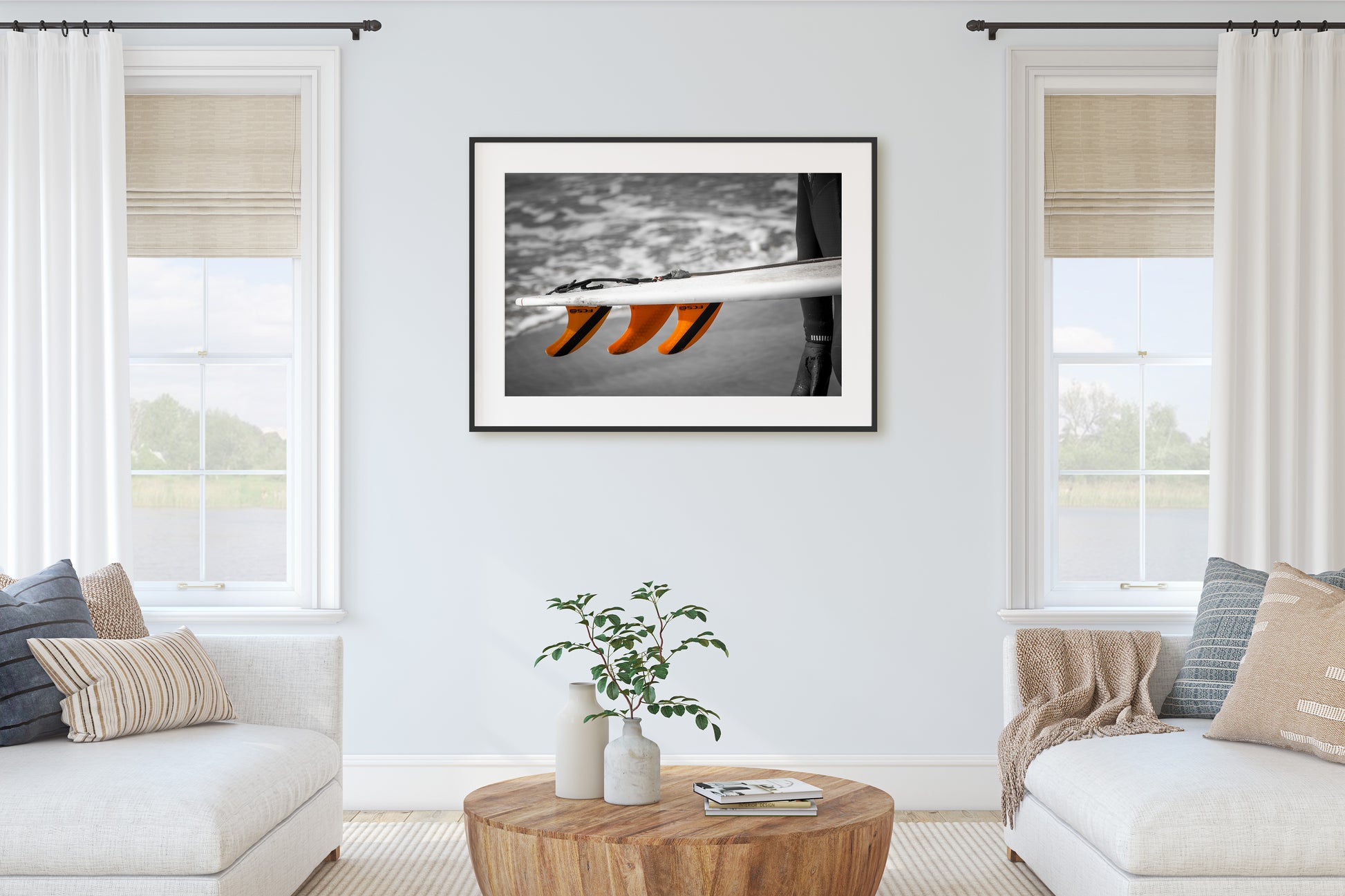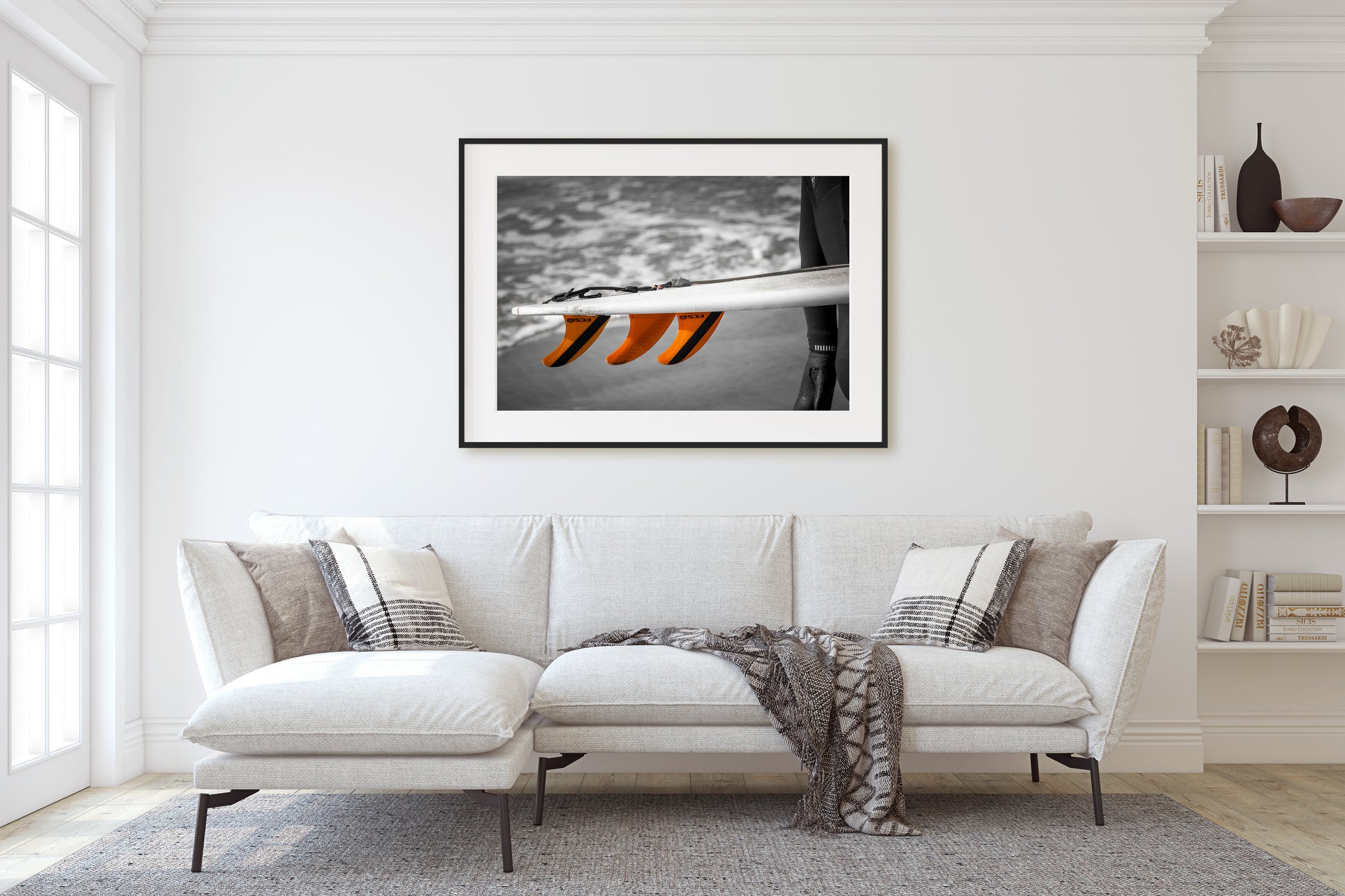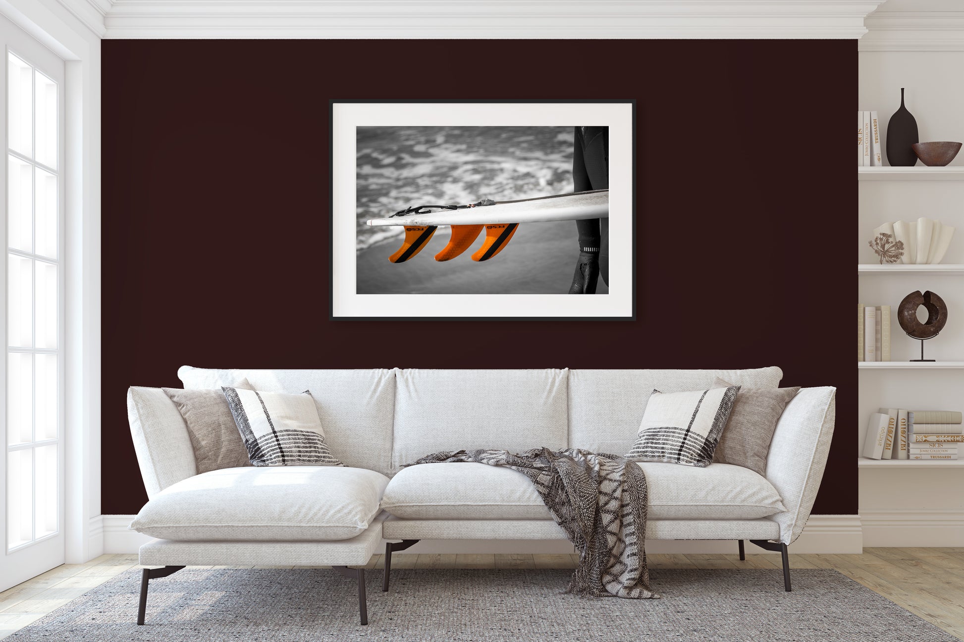 I shot this in Tofino in May 2022, drawn in by the way the bold orange fins cut through the muted tones of the surf. Stripped of distractions, the black-and-white background makes the color pop even more, pulling you into the moment. A story without an ending—was this board just out of the water, or about to launch into the next wave?