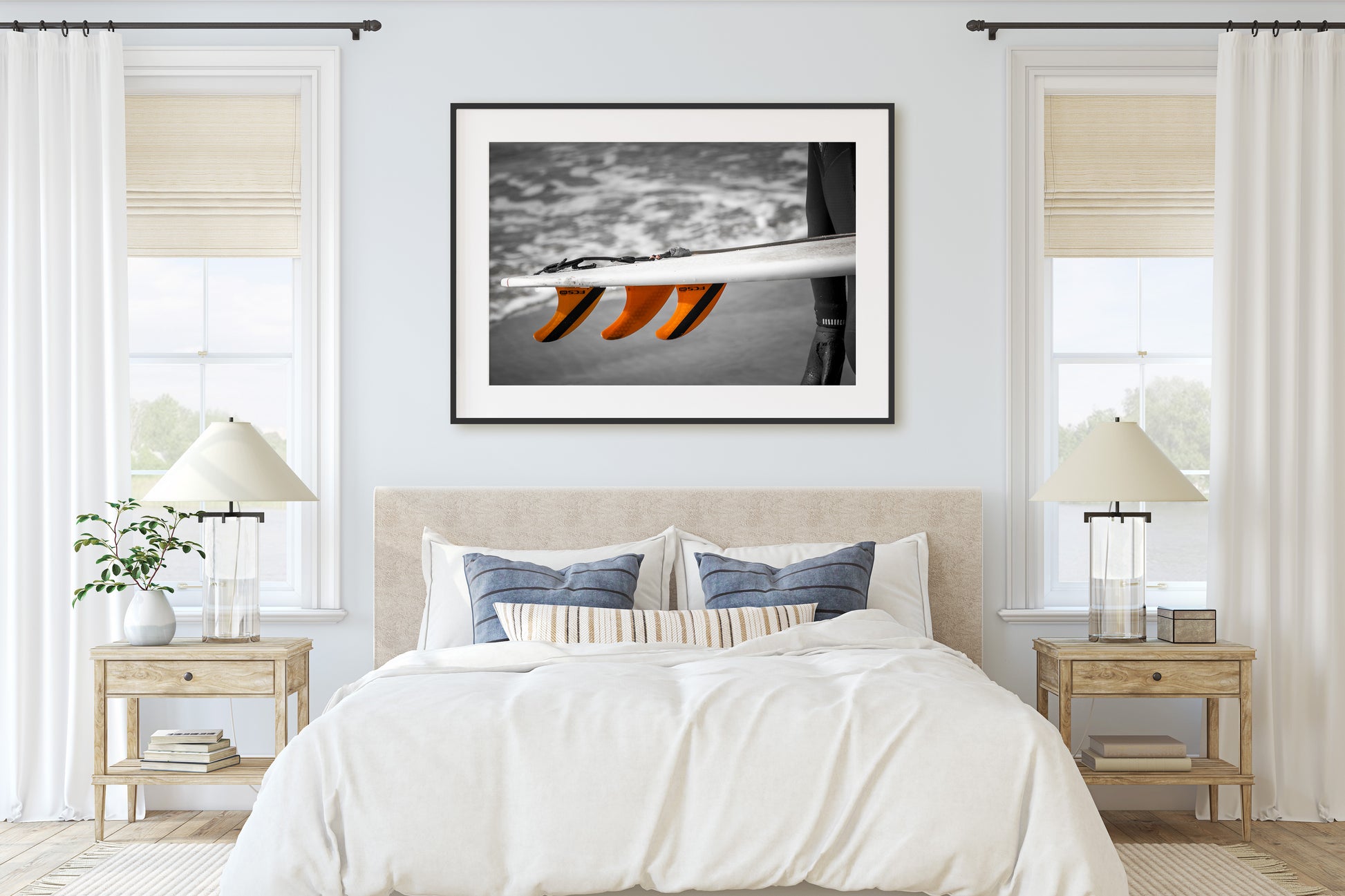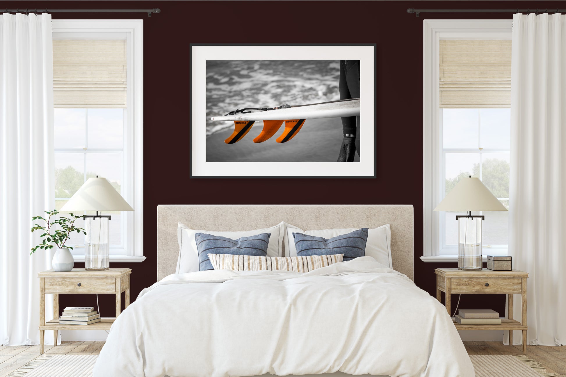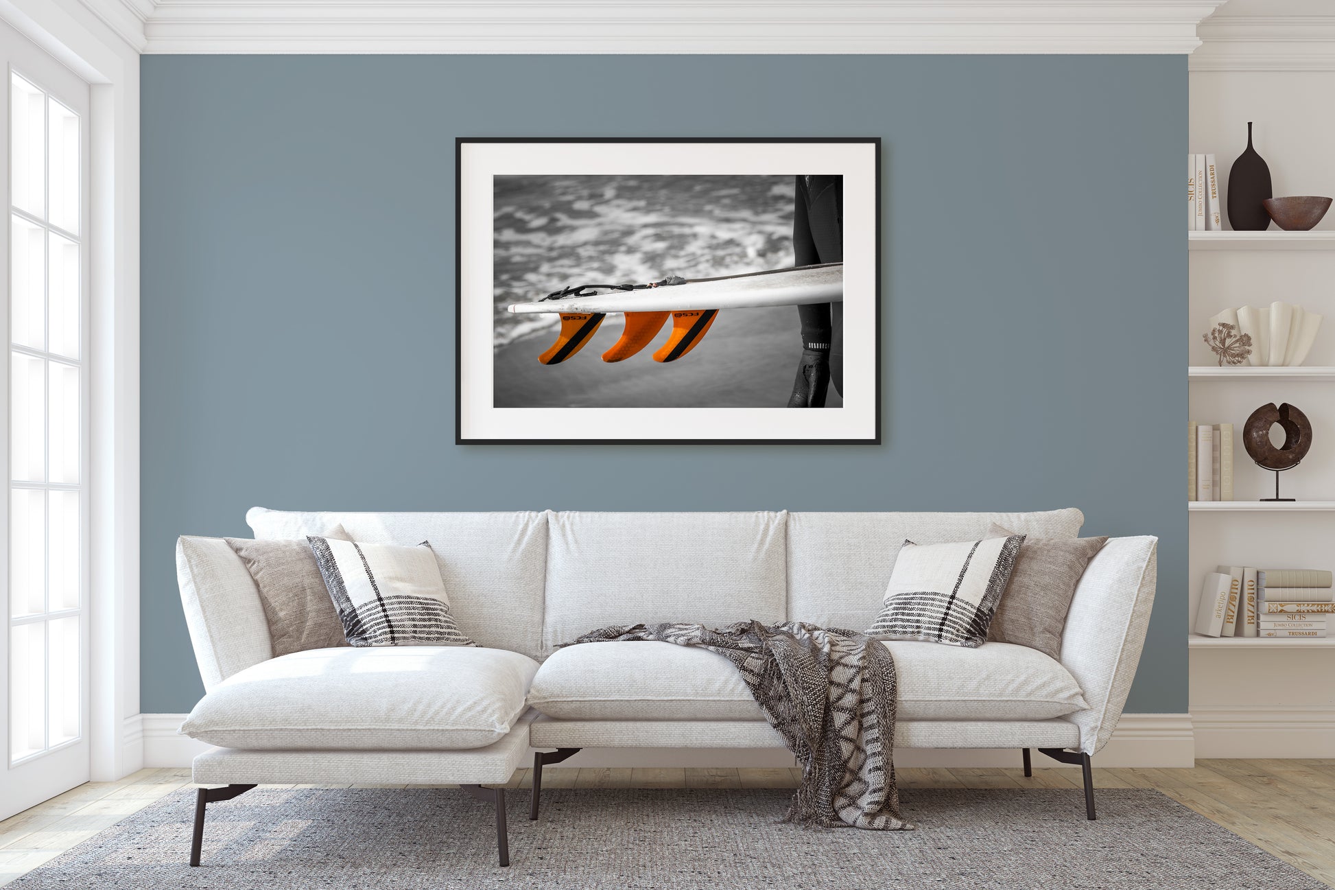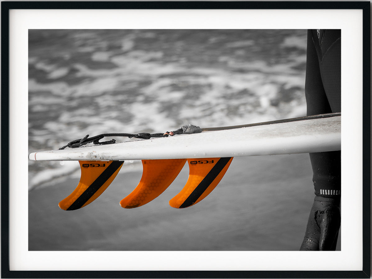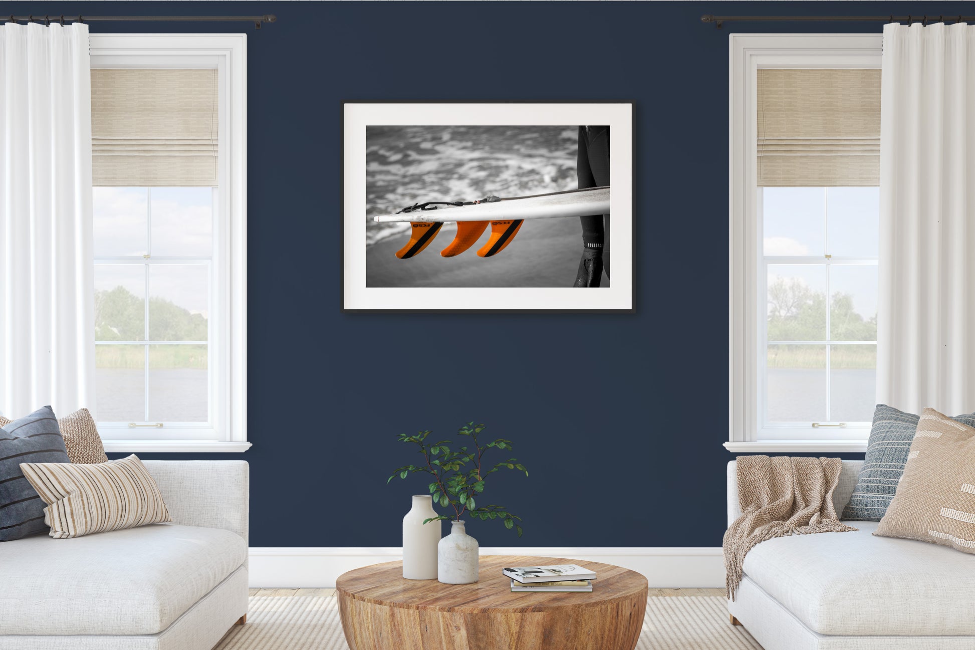 I shot this in Tofino in May 2022, drawn in by the way the bold orange fins cut through the muted tones of the surf. Stripped of distractions, the black-and-white background makes the color pop even more, pulling you into the moment. A story without an ending—was this board just out of the water, or about to launch into the next wave?